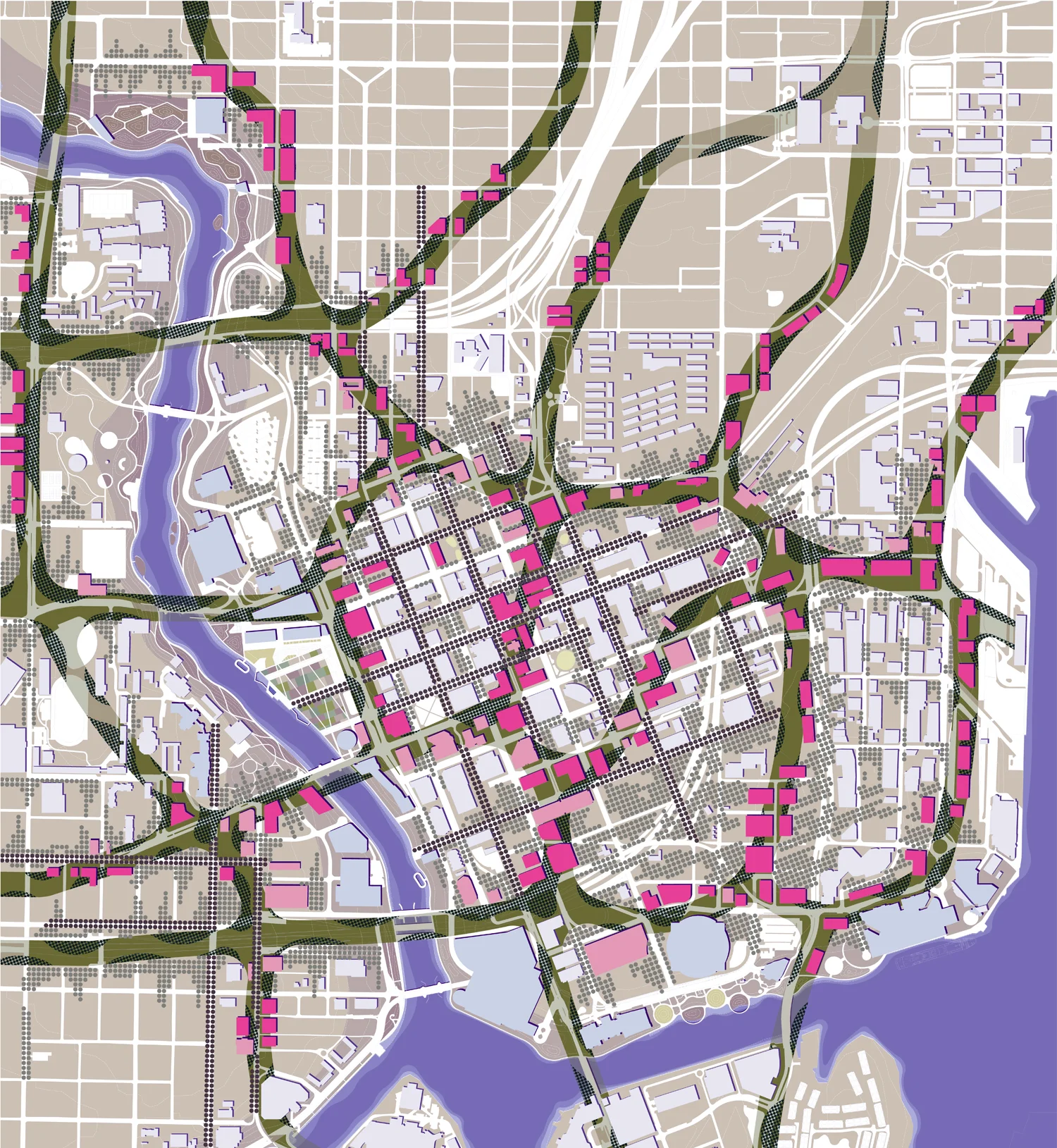 The city and river are restitched when the natural fluxuations of the river are incorporated into the static urban structure and the river once again becomes relevant in the social fluxuations of the city. Seeded plantings of native forest types increase the value of development zones and provide ecosystem services to the urban structure. Rather than a simple concrete edge, a functional riverfront creates habitat for native species and provides ecosystem services, such as runoff filtering and water retention, to the urban structure. Natural river fluxuations increase biodiversity and create a system with a high degree of ecosystem function. Temporary flooding creates disturbance in plant communities and in this way the landscape is grown rather than installed.