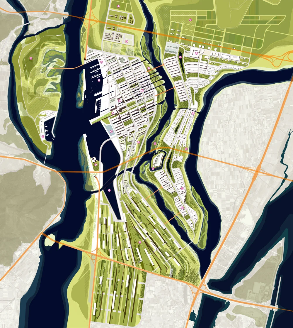 The grids, links and nodes of the city will be made in harmony with the flow and the function of water. The function-link system among the logistics innovation cluster, the state-of-the-art knowledge and information industries, the city culture and residence will be maximized to configure the various scales of the city.